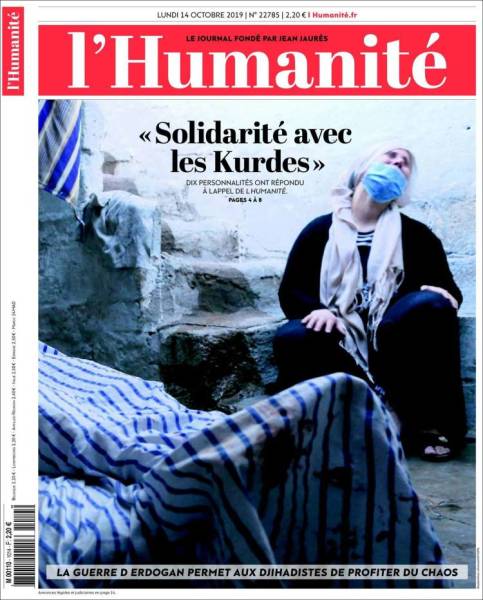 Rojnameya L'Humanîte wêneyê dayikeke Kurd ku li ber xizmekî xwe yê şehîd dilorand, li gel sernava 'Hevgritina bi Kurdan re'' bi kar anî. Rojnameyê got ''Şerê Erdogan dike ku cîhadî ji kaosê sûd werbigirin'' û têkilî dagirkeriyê cih da hevpeyvîna bi dehan kesan re hatî kirin. Di nûçeyê ya bi imzeta Pîere Barbancey hate gotin, ''Ji ber sedema Erdogan cîhadî dîsa tên''.