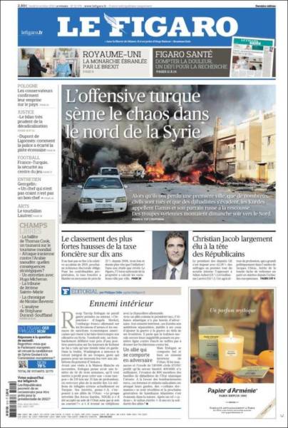 Rojnameya Le Fîgaro jî bi manşêta ''Operasyona Tirk a li bakurê Sûriyê kaosê çêdike'' derket, li gel wêneyê bombebaran dewleta Tirk a dagirker. Rojnameyê got, ''Ji ber bombebaran Tirk nêzî 800 DAÎŞ'î reviyan, dûvikên Enqerê yên Ereb ji niha ve gelek komkujî kirin.''