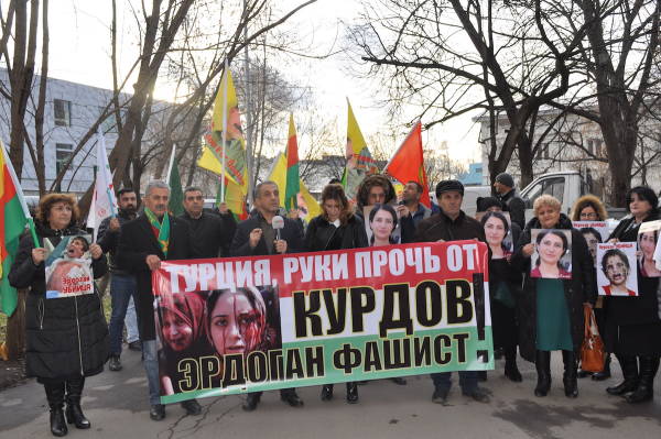 Nûnerên Saziyên Kurdan ên li Rûsyayê li Navenda Çanda Kurd a Moskowayê bi rengekî hevpar daxuyaniyek ji raya giştî re ragihandin. Hevserokê Yekîtiya Saziyên Civaka Kurd a Navneteweyî Araf Azamanî bi navê nûnerên saziyan axivî û got, "Erdogan dixwaze tola DAÎŞ'ê ji Kurdan hilîne. Dinya hemû bi têkiliya dewleta Tirk a bi DAÎŞ'ê re zane. Lewma yên ku niha êrîşî Rojava dikin artêşa Tirk û çeteyên DAÎŞ'ê ne."