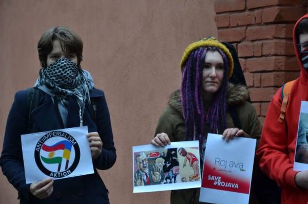 Li paytexta Ûkrayna Kîevê jî ciwan li pêşiya Serkonsolosxaneya Tirk li hev kom bûn û êrîşên dewleta Tirk a dagirker ên li dijî Bakur û Rojhilatê Sûriyeyê şermezar kirin.