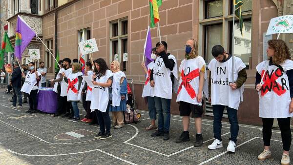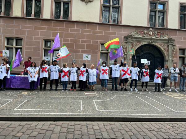 Di çalakiya ku bi pêşengiya Meclîsa Jinan Nûdayê, li navenda Freiburgê hat kirin de wiha hat gotin: ‘’Em jinên Kurd, bi cangoriyên azadiyê yên têkoşîna pûçkirina konsepta êrîşa dagirkeriyê ya faşizan didin re ne. Ji bo ji wan re bibin deng em ê li qadan bin.’’