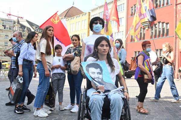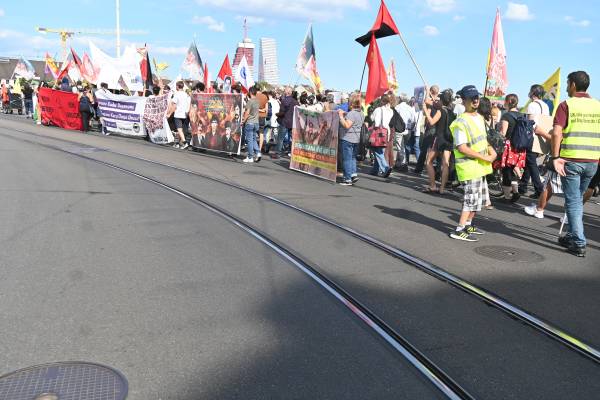 Gel li vê derê posterê Arîn Mîrkan, alayên PKK, YPG û YPJ’ê hilda û dest bi meşê kir. Piştî meşa bi qasî saetekê gelê ji bo bîranîna 33 cangoriyan jî tevlî meşê bûn. Gel meşa xwe li Claramatteparkê bi dawî kir.