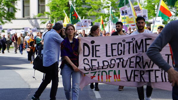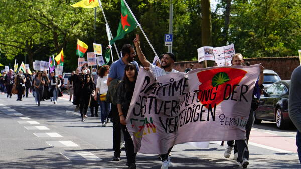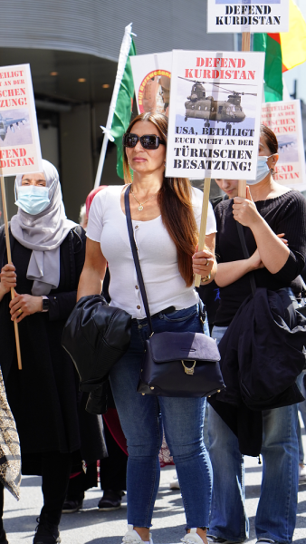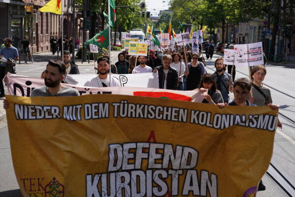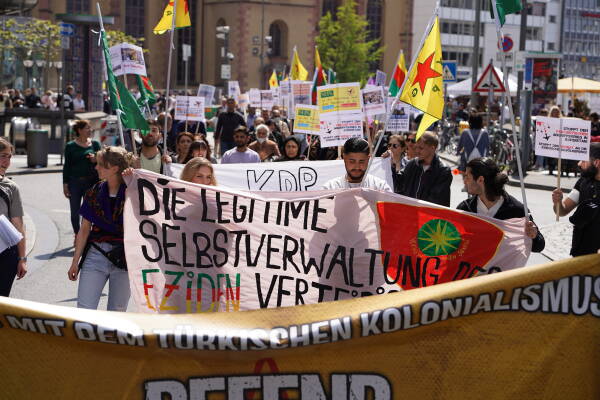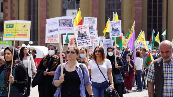 Bi pêşegiya Tevgera Jinên Kurd a Ewropayê, Kurdistanî û dostên xwe yên li Hauptwache ya Frankfûrtê hatin ba hev, bi dirûşman ber bi Balyozxaneya DYE’yê ve meşiyan. Çalakgeran ne bi tenê bi bêdeng mayîna li dijî êrîşên dewleta Tirk, bi ser de fînanse kirina şerê dewleta Tirk a NATO û Elmanyayê pişta xwe dan balyozxaneyê.