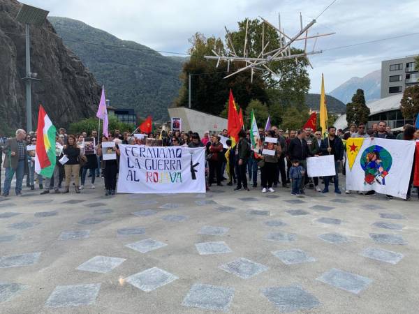 Bi hezaran kesên li Qada Pîazza Çastelloyê ya bajarê Torîno yê Îtalyayê kom bûn dagirkeriya li Rojava şermezar kirin. Komên mîna Askatasûna, Cabrîo, Arcî, Groppo, Abele, Ggîel, Notav û Fanans Fanos û Dayikên Aştiyê piştgirî dan çalakiyê. Her wiha li qada Pîazza Vîttorîa yê jî mîtîngek hate kirin.