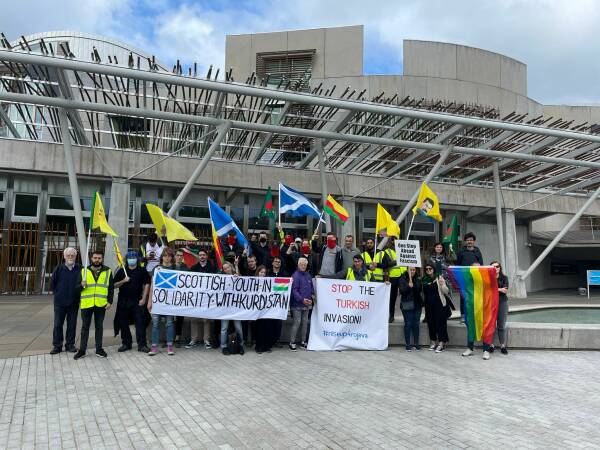 Bi pêşengiya Meclîsa Gelê Kurd û komên enternasyonalîst li Îskoçyayê jî li ber avahiya parlamentoyê çalakiyek hat lidarxistin. Di çalakiyê de daxwaz ji Parlamentoya Îskoçyayê hat kirin ku li dijî êrîşên dagirkeriyê yên li ser Kurdistanê bibe xwedî helwest û nehêle Îngilistan çekan bifiroşe dewleta Tirk.