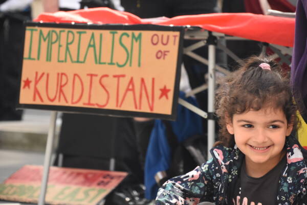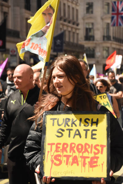 îna çekên kîmyewî û polîtîkayên dagirkeriyê yên li Kurdistanê yên dewleta Tirk hat nîşandan. Di çalakiyê de timî dirûşmeyên ‘’Bimire faşîzma Tirk’’, ‘’Piştgiriya Tirkiyeyê neke Îngilistan’’, ‘’Li dijî faşîzmê Kurdistanê biparêze’’, ‘’Ji şerê li Kurdistanê re bibêj êdî bes e.“, ‘’Dewleta terorîst, Erdoganê terorîst’’, ‘’Bijî Serok Apo’’, ‘’Kurdistan wê gora faşîzmê’’ û ‘’Bimire xiyanet’’ hatin berzkirin.