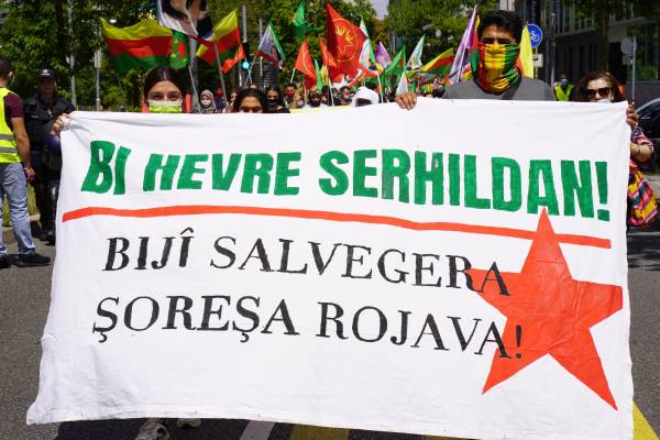 Parlementerê Dîe Lînkeyê Hakan Taş jî şoreşa Rojava silav kir. Piştî meşê polîsên Berlînê êrîşî girseyê kir û 5 kes destgîr kir.