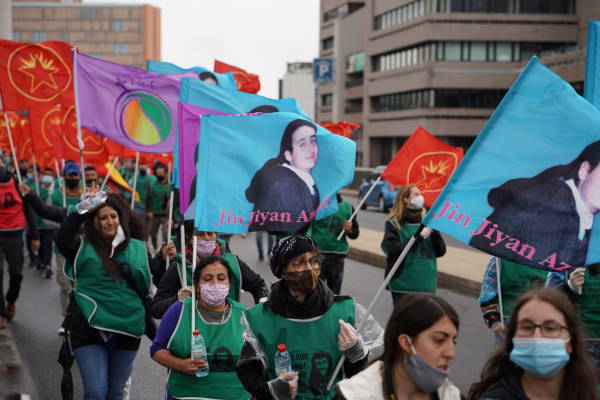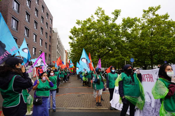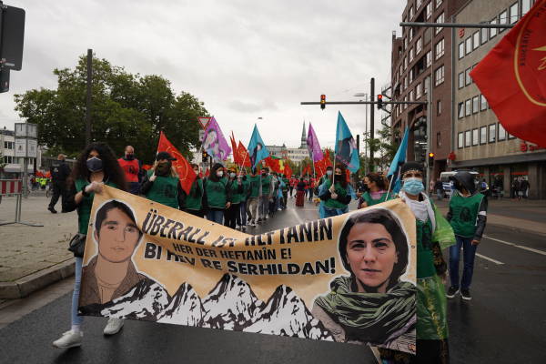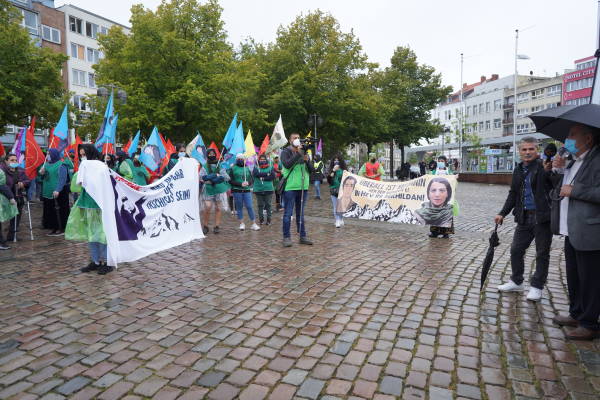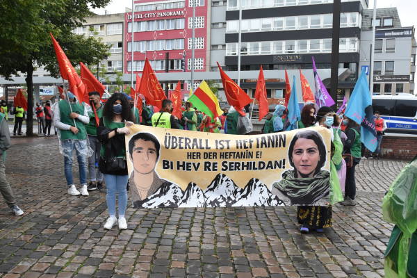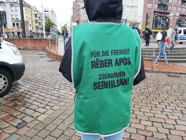 Tevî qedexeyan ciwanan bi dirûşmên Elmanî û Kurdî azadiya Ocalan didomînin, Cenga Heftanînê silav dikin.