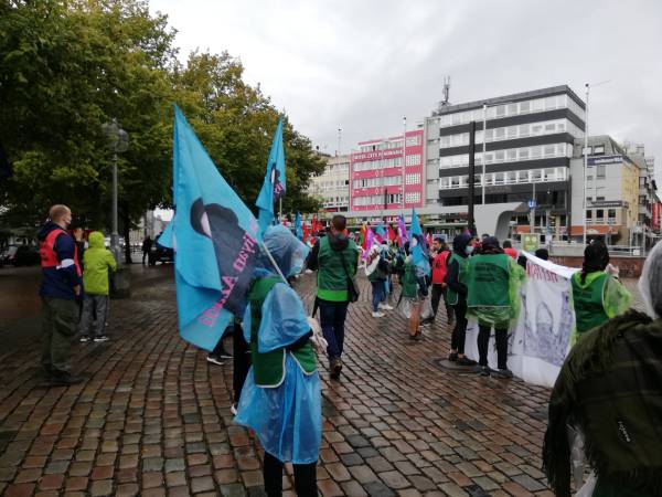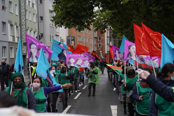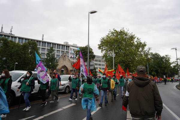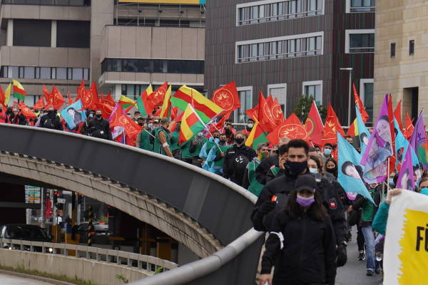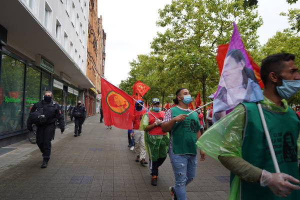 Meşa ciwana bi kombûna saetên sibê û dayîna daxuyaniyekê û şûnde destpê kir. Hê çalakî destpê nekirî polîsên Elman dirûşmên têkildarî Ocalan û PKK’ê qedexe kirin. Posterên Ocalan, alên PKK, KCK, YPJ, alên Yekîtiya Xwendekarên Kurdistan YXK û JXK’ê jî hatin qedexekirin.