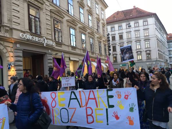 GRAZ: Li bajarê Grazê yê Awûstûryayê jin ji Hauptplatzê dest bi meşê kirin û 8'ê Adarê pîroz kirin. Jinên Kurd jî bi kincên xwe yên gelêrî tevlî meşê bûn.
