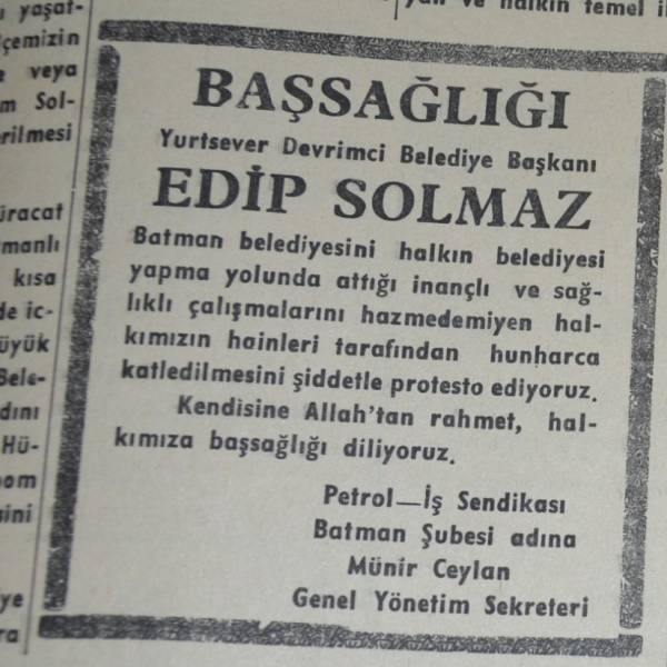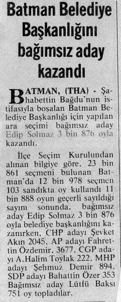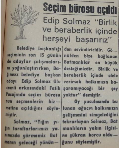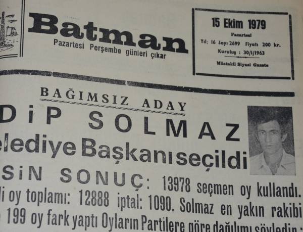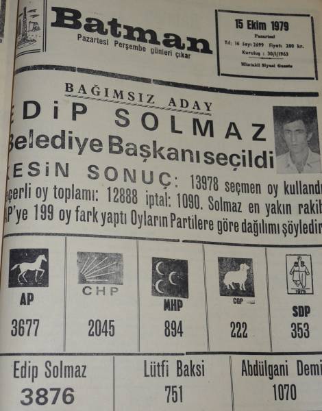 Edîp Solmaz di sala 1979’an de li Êlihê şaredarî qezenc kir. Qezenckirina tevgera azadiyê ya şaredariyê li hemû Kurdistanê deng veda.