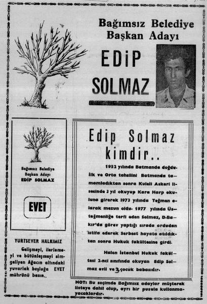 Apoyiyan wê demê biryar dan ku pêşengekî gel namzet nîşan bidin. Edîp Solmaz ê 27 salî dibe ‘namzetekî serbixwe’ lê li Êlihê her kes dizane ku ew kadroyekî PKK’ê ye. Karê kadro û sempatîzanan qet ne hêsan e. Di wan salan de wekî li hemû Kurdistanê şaredarî di destê eşîran de ne yên ku bi partiyên pergalê re dixebitin.