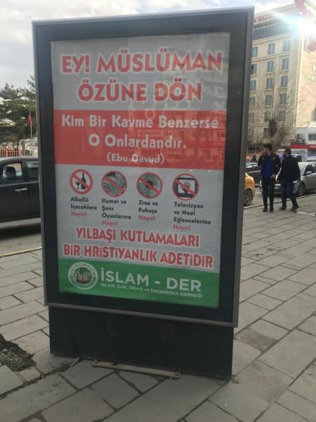 Komeleya bi navê Îslam Der, li bîlboardên ji aliyê qeyûm ve ji wan re hatiye dayin, afîşa bi nivîsa "Ey Misilman, li cewhera xw evegere. Pîrozbahiyên sersalê adeteke Xiristiyanen e" daliqand. Her wiha baweriya Xiristiyaniyê jî weke qumar, fûhûş û alkolê tê nîşandan.