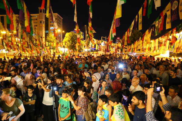 Li çar aliyên bajêr al, pankart û afîşên HDP'ê, wêneyên namzetê Serokkomariyê Selahattîn Demîrtaş û namzetên parlamenteriyê yên Amedê hene. Lewma li her devera bajêr xeml û rengê HDP'ê heye.