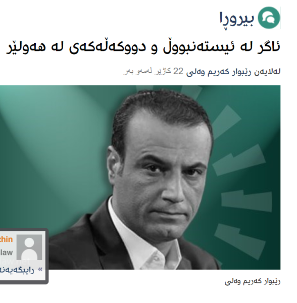 Li beramberî vê jî kesekî bi navê fermandarê Hêzên Dije Teror a Kurdistanê ku nêzîkî Serokê Hikûmeta Herêma Kurdistan Mesrûr Barzanî û pismamê Nêçîrvan Barzanî ye bi peyameke di bin navê ‘Bersiveke tund ji bo Rêbwar Kerîm û axayên wan’ li ser malpereke fermî ya Hêzên Dije Teror a Kurdistanê hatiye belavkirin vê dibêje: “Ev demeke Rêbwar Kerîm Welî be fîtika axayên xwe wisa li gel kiriye ku binegeh bide çêkirin ku hikûmet lewaz bide nîşandan.”
