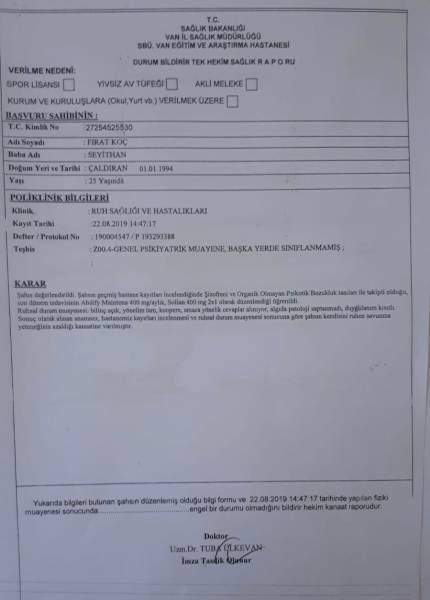 Rapor ji aliyê Nexweşxaneya Perwerdehî û Lêkolînê ya Wanê hatiye amadekirin û tê diyarkirin ku Koç nexweşê şîzofreniyê ye.