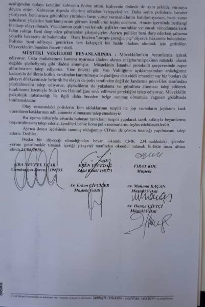 Koç di îfadeya xwe ya li dozgeriyê de got ku “Ez baş nizanim çend kes bûn lê gelek kes bûn. Bi pehîn û jopan li mil û pêyê min dan. Piştre bi kaskê li serê min dan. Li derveyî qehwexaneyê destê min ji paş ve girêdan. Canê min gelek cih reşûşîn bûye. Dema ku wan polîsan li min da, heqaret û çêr li min kirin.”