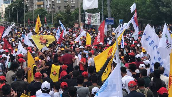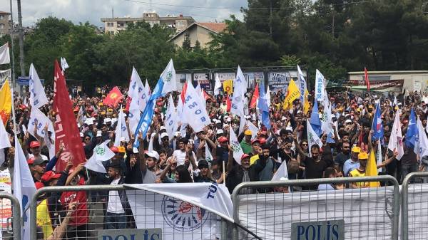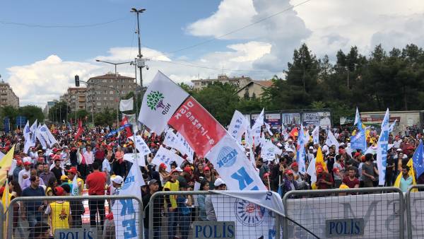 Mîtînga DÎSK, KESK, TMMOB û TBB’ê ya sirûda “Bi 1’ê Gulanê em ê rojên xwe bijîn” û “Bijî 1’ê Gulanê” li Qada 5 Hezîran a Demokokrasiyê saet 13:00’an destpê kir. Di mîtîngê de pankartên bi nivîsên “Kedam me, bedena me, nasnameya me ya me ye”, “Bijî 1’ê Gulan”, “Aştî jî Bihar jî jin wê bîne” û “Ji bo jiyanek weke mirovan û ewlekariya kar ji Rewşa Awarte re NA” vekirin, ketina qadê ji çar aliyan ve destpê kir.
