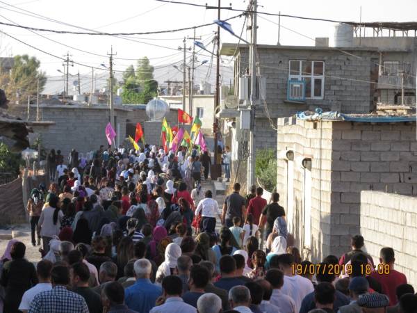 Welatiyên Wargeha Penaberan a Şehîd Rûstem Cûdî (Mexmûr) li dîjî bombebaran û dagirkeriya dewleta Tirk a ser wan meşiyan. Meşa ku li ber deriyê şaredariya wargehê destpêkirî heta ber avahiya Neteweyên Yekbûyî (NY) dom kir. Di meşê de dirûşmeyên ‘Bijî Serok Apo','Şehîd Namirin' û 'Bimre Xiyanet’ hatin berzkirin.