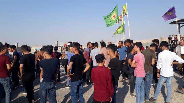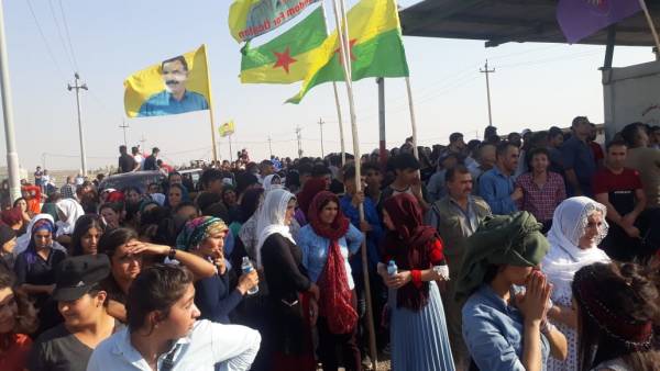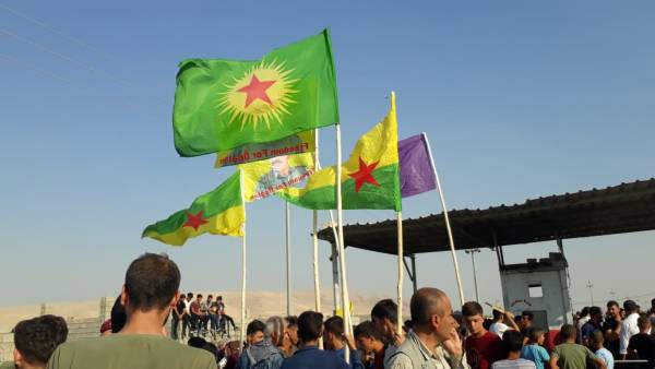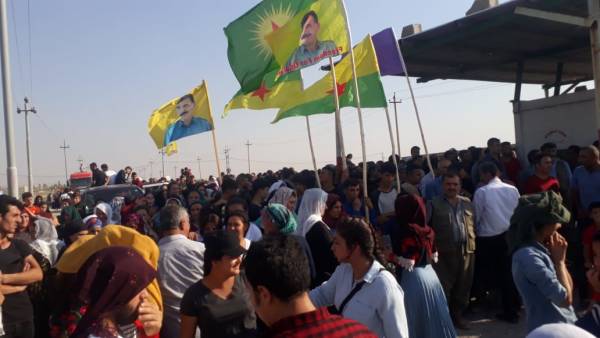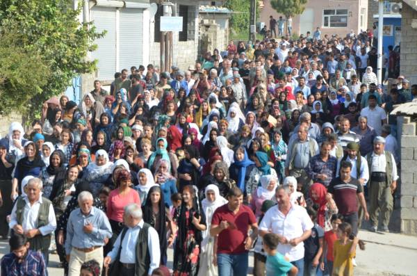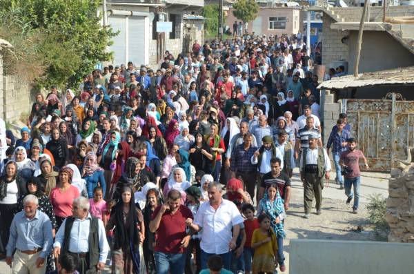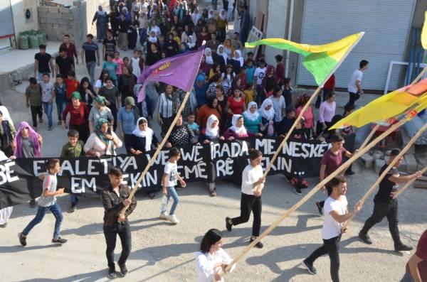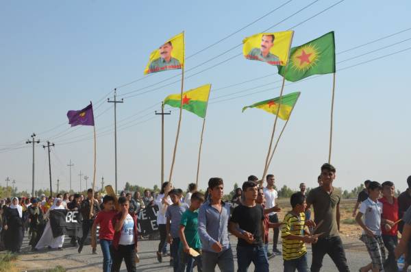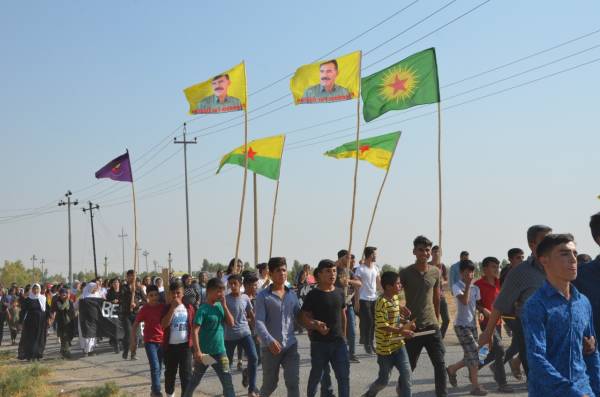 Di meşê de posterê Rêberê Gelê Kurd Abdullah Ocalan, alên KJK'ê û KCK'ê hatine bilind kirin. Herwiha dirûşmeyên 'Bijî Serok Apo' û 'Berxwedan jiyane' berz dibin.