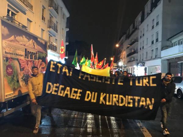 Li bajarê Drancy ê Fransayê, endamên Tevgera Ciwanên Şoreşger li dijî êrîşên dewleta Tirk ên li ser Kobanê û Girê Spî meşek protestoyî organîze kir.