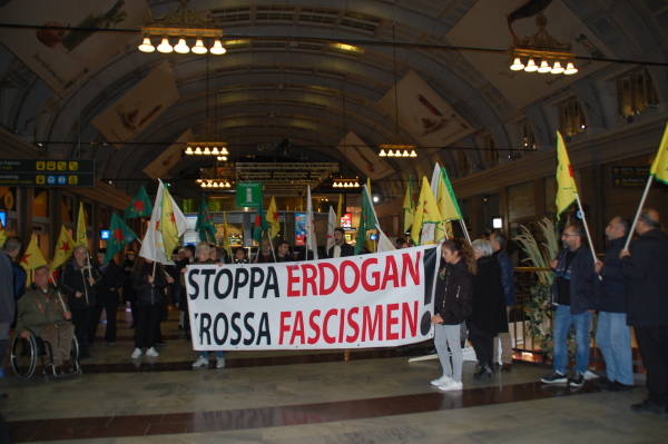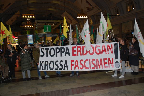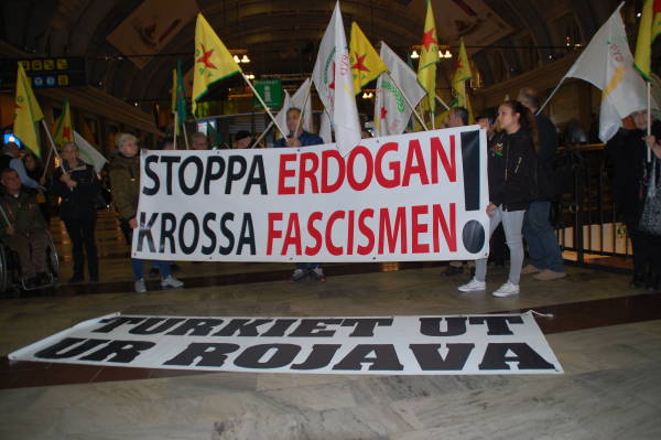 Çalakiya protestoyî ya li paytexta Swêd Stockholmê nîvê şevê pêk hat û pankartên "Erdogan rawestînin, bimire faşîzm" û "Tirkiye ji Rojava bicehime" her wiha alên PYD, YPG/YPJ'ê hatin hildan.