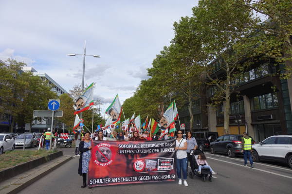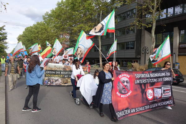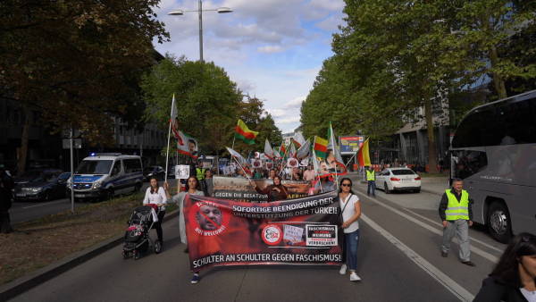 STÛTTGART: Mirovên ji gelek partî û gelan tevlî xwepêşandanê bûn û posterên Rêberê Gelê Kurd Abdullah Ocalan hatin hildan. Alîgirên HDK-A, Navenda Civaka Demokratîk a Kurd, MLKP, PARTÎZAN û MLPD jî beşdarî çalakiyê bûn û pankarta bi nivîsa "Em Erdogan ê kujer naxwazin" hate vekirin. Elmanan jî bi baldarî meşa ku bi 5 kîlometreyan dewam kir, şopandin. Di dema meşê de belavokên bi nivîsa "Erdogan bi xêr nayê Elmanyayê" hatin belavkirin.
