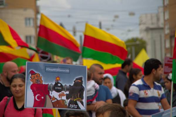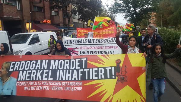 BERLÎN: Tevî Kurdistanî, Elman û Tirkiyeyiyan, mirovên ji gelek miletên cuda jî tevlî çalakiyê bûn. Meşê ji Hermannplatzê dest pê kir û heta meydana Oranîenplatzê dewam kir. Di çalakiyê de ku gelek saziyên koçber, partiyên siyasî û komên çep jî destek dan, pankarta bi nivîsa "Erdogan dikuje, Merkel jî digire" hate vekirin." Bi sedan dowîzên ji wêneyên Erdogan ku nivîsa "Stop" li ser bû hatin hildan û hevkariya hikumeta Merkel a bi rejîma Erdogan re hate protestokirin.