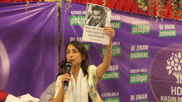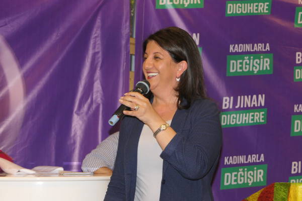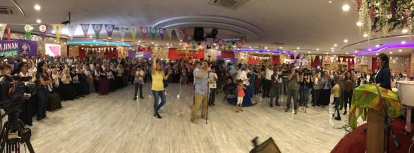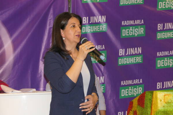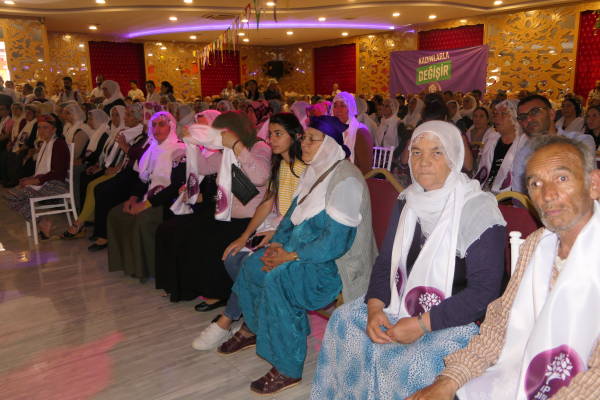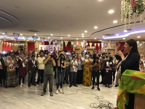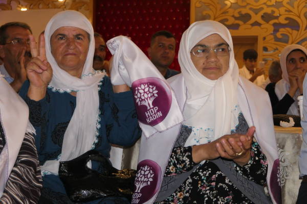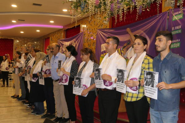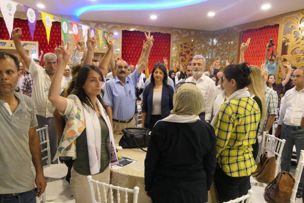 Hevseroka Giştî ya HDP’ê û namzetên parlamenteriyê yên HDP’ê beşdarî civînê bûn. Li salona civînê pankarta ‘Bi jinan re diguhere’ , ‘Namzetê me Demîrtaş’ , ‘Bi jinan wê guhertin çêbibe’ û ‘Bi te diguhere’ hatin daliqandin.
