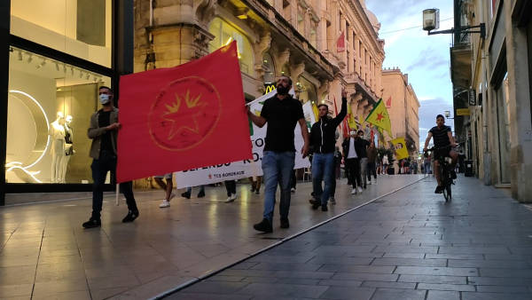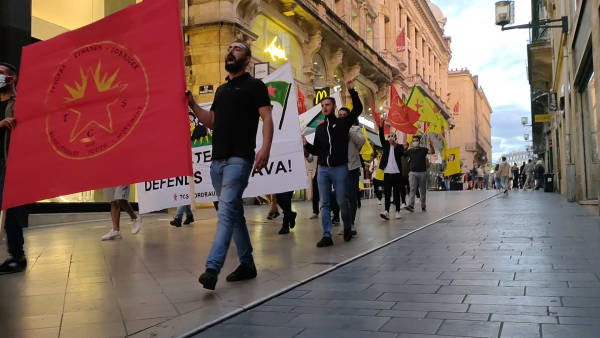 Di meşê de ku li kolana Saînte Catherîneyê dewam kir bi zimanên Fransî û Kurdî pankartên bi nivîsa "Bi hev re serhildan", "Rojava biparêze" hatin hildan û aleke mezin a TCŞ'ê hate vekirin.