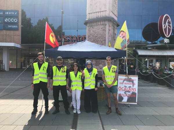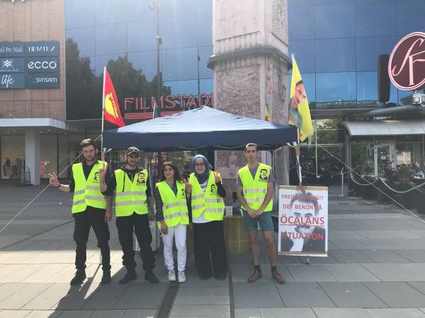Ciwanên Kurd konê xwe yê çalakiyê li meydana Storatorgetê vedan û wêneyên Rêberê Gelê Kurd Abdullah Ocalan û alên PKK'ê pê ve kirin. Ciwanan li ser tecrîda giran a li ser Rêberê Gelê Kurd Abdullah Ocalan, dagirkirina Efrînê û êrîşên dewleta Tirk ên li ser Başûrê Kurdistanê belavok belav kirin.