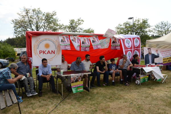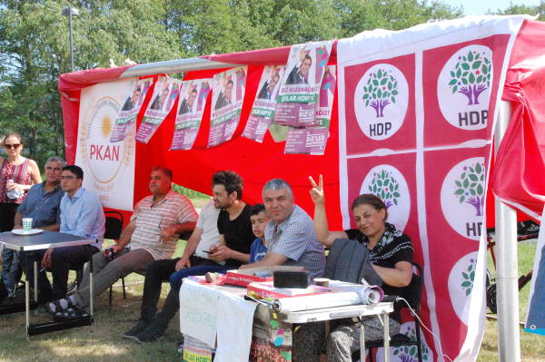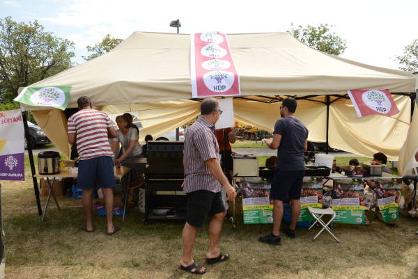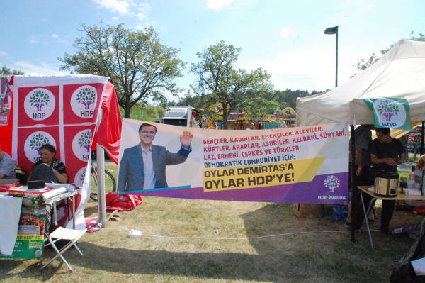 Kurdistaniyan li qada festîvalê stand vekirin, ala HDP’ê, wêneyê namzetê serokkomariyê yê HDP’ê Selahattîn Demîrtaş daliqandin. Têkildarî hilbijartinên 24’ê Hezîranê gel hate agahdarkirin.