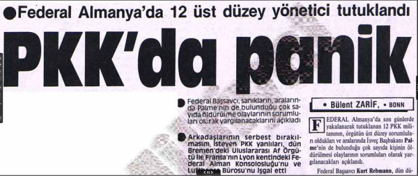 Di vê navberê de di navbera 18-20'ê Çileya 1988'an de li Dursseldorfê konferansa polîsan a navneteweyî pêk hat. Du pisporên terorê yên Swêdê ku dosya Palme di çeteyê wan de bû beşdarî vê civînê bûn. Di civînê de servîsên veşartî yên Ewropî biryar dan ku li dijî PKK'ê têkoşîneke hevpar û bi bandor bikin. Piştre di nava meha Sibatê de bi fermana Rebmann polîsên Elman ketin nava liv û tevgerê. Endamên Komîteya Navendî ya PKK'ê Alî Haydar Kaytan û Dûran Kalkan jî di nav de nêzî 20 kes li bajarên cuda hatin destgîrkirin. Hasan Hayrî Guler ku ji aliyê medya Tirk ve weke "kujerê Palme" hate ragihandin yek ji wan kesan bû ku destpêkê hate girtin. Guler ku li Dusseldorfê hate darizandin wê cezayê muebetê lê bihata birîn, piştî ku 10 salan bi tena serê xwe li hucreyê hate hiştin bi giştî 15 salan girtî ma, wê sala 2003'an bihata berdan.
