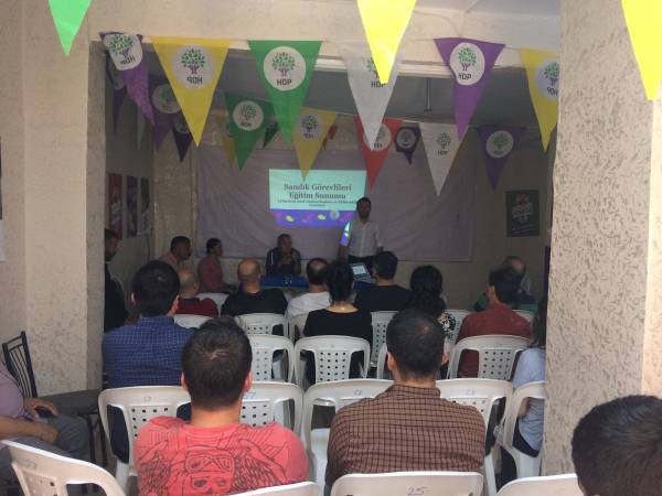 Rêxistina HDP'ê ya Navçeya Bagcilar a Stenbolê, endamên Desteya Sindoqê perwerde dike. Perwerdeya li ser hilbijartinê li her buroya hilbijartinê ya li taxan tê dayin. Di perwerdeyê de bi rêya slayt û belavokan qala gavên hiqûqî û pêvajoyên qanûnî tên kirin.