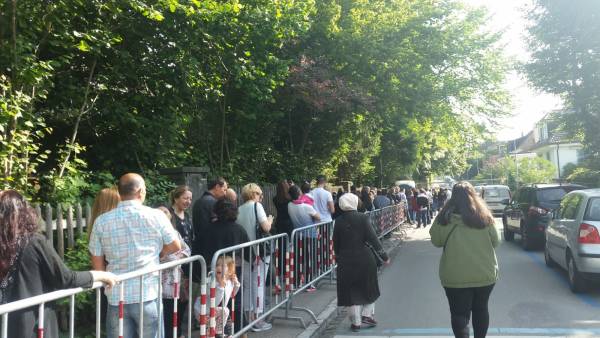 Dengdêrên li Bern û derdorî wê dijîn ji bo dengên xwe bikar bînin di saetên sibe de berê xwedan Sefaretxaneya Tirk a li Bern. Piranî kesên ji bo dengdanê berê xwe danyîn navenda dengdanê ku ciwan bûn bal kilşand. Piraniya kesên ku hatibûn dengên xwe bikar anîn dengên xwe dan HDP’ê û Demîrtaş.