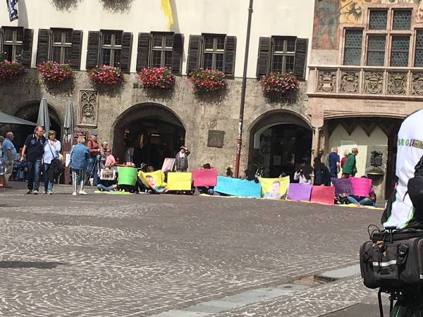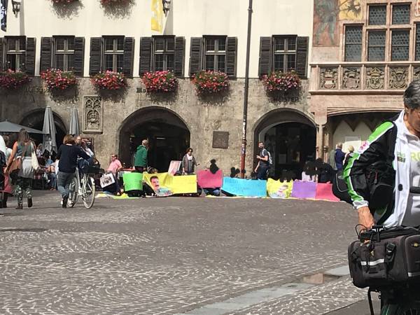 Çalkaî li ber Goldenen Dach a li navenda bajêr pêk hat, belavok hatin belavkirin û dowîz-pankart hatin vekirin.