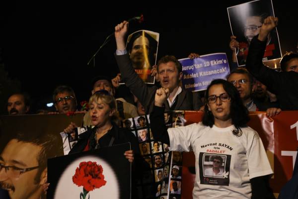 Çalakiya di bin dorpêça polîs de pêk hatî bi deqeyek rêzgirtinê destpê kir. Di çalakiyê de wêneyên qurbaniyên komkujiyê hatin bilindkirin û dirûşmeyên, “10’ê Cotmehê jibîr neke, nede jibîrkirin”, “Li dijî faşîzmê mil bi mil têkoşîn”, “Wê kujer hesab bidin”, “Şehîd namirin”, “bijî biratiya gelan”, “Wê hesabê 10’ê Cotmehê bê pirsîn”, “Şehîdên aştiyê nemir in” hatin berzkirin.