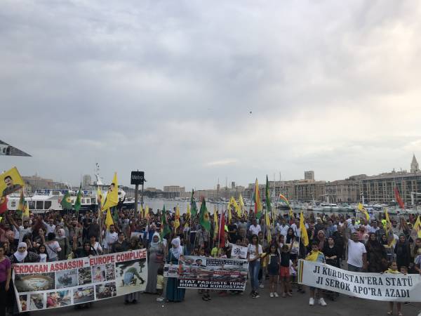 MARSÎLYA: Kurdistaniyên li Marsîlyayê jî êvarê li meydana Canebîereyê li hev civiyan û bi qîrîna dirûşmên "Erdogan li dijî şaredariyên Kurdan darbe kir", "Kujer Erdogan" dest bi meşê kirin. Bi sedan kes piştre li qada Canebîere-Vîeûx-Portê çalakiya rûniştinê kir. Qisekeran diyar kirin ku dewleta Tirk darbe li dijî şaredariyên Kurdan kiriye.
