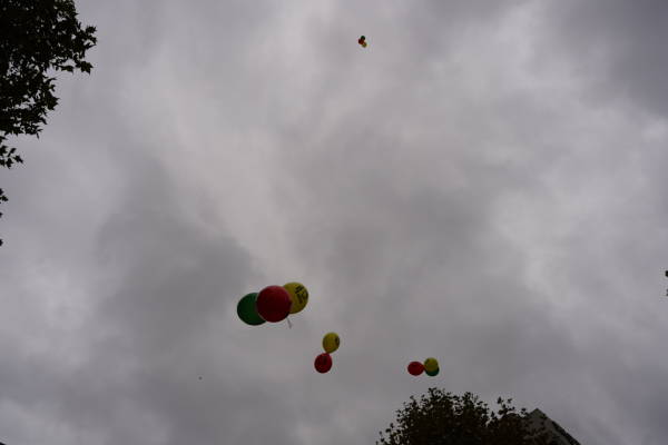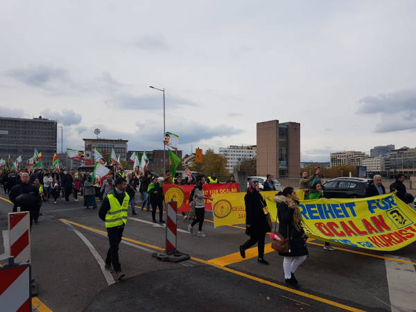 Di dema meşê de ji bo Ocalan dirûşm hatin qîrîn û belavok hatin belavkirin. Kurdistaniyan her wiha balonên ku wêneyê Ocalan li ser bû firandin.