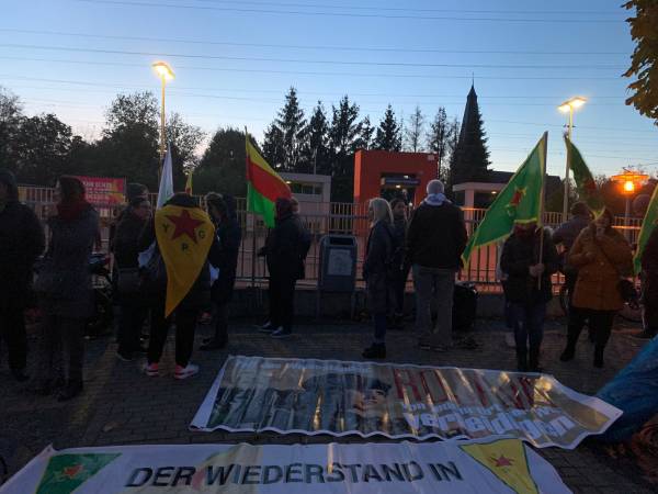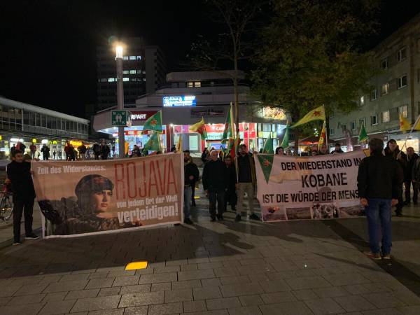 Çalakgeran pankarta bi nivîsa "Parastina Rojava li her deverê ye" hildan û bi Elmanî û Kurdî ji bo berxwedana Rojava dirûşm qîriyan.