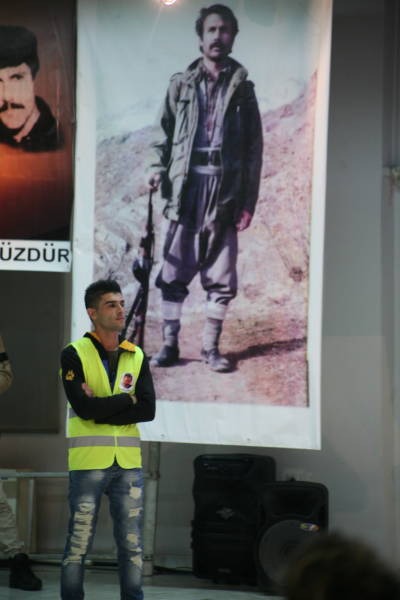 Li hêwanê posterên mezin ên Rêberê Gelê Kurd Abdullah Ocalan û fermandarê mezin ê PKK'ê Mahsûm Korkmaz (Egîd) û alayên PKK'ê, KCK'ê hatin daleqandin.