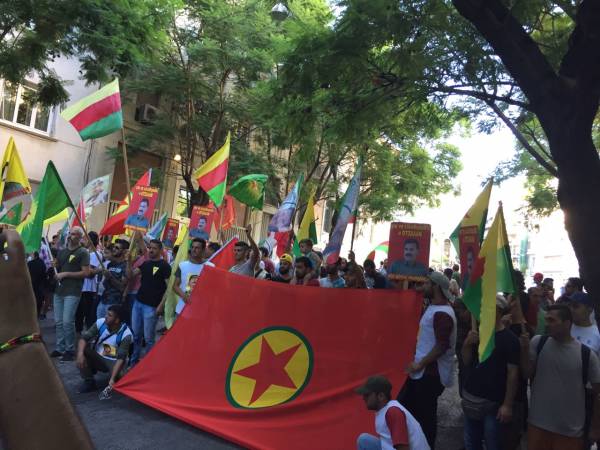 Di meşê de pankartên bi nivîsa "Azadî ji ocalan re, statu ji Kurdistanê re", "Bila dawî li polîtîkaya tecrîdê were anîn" û posterên Ocalan hatin hildan. Çalakgeran dirûşmên "Bê Serok jiyan nabe", "Azadî ji Ocalan re, statu ji Kurdistanê re" qîriyan û belavok belav kirin.