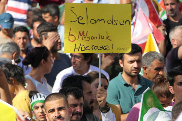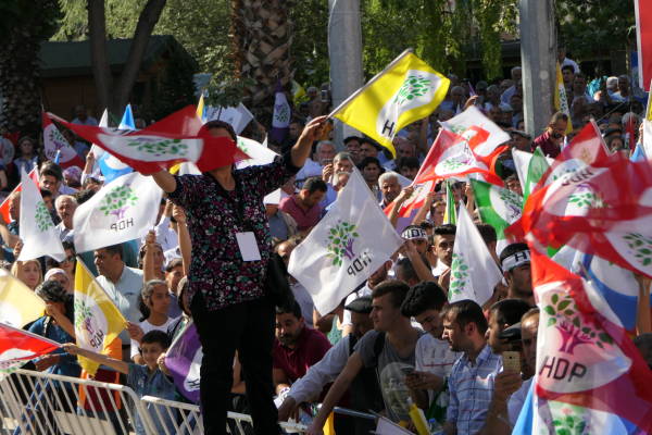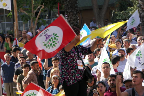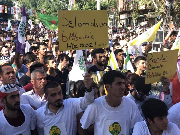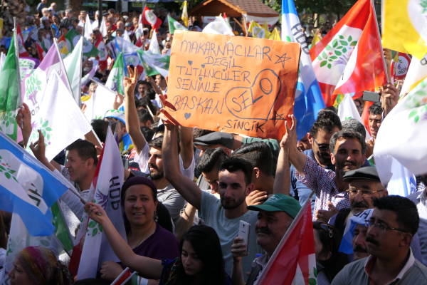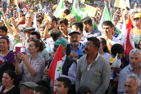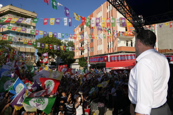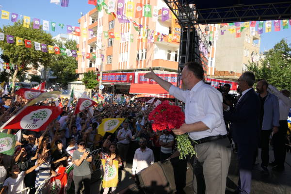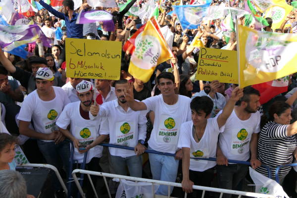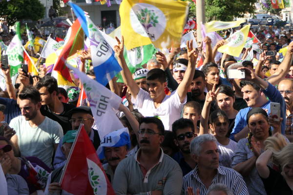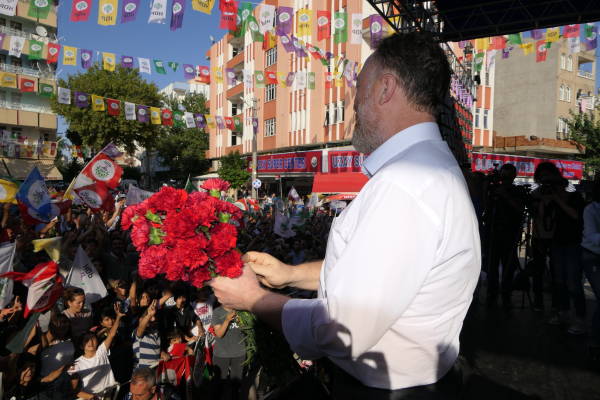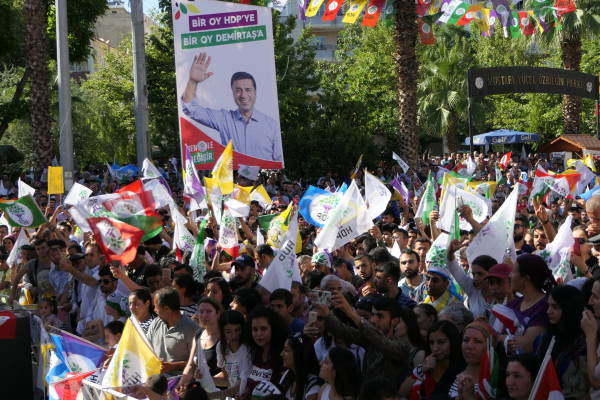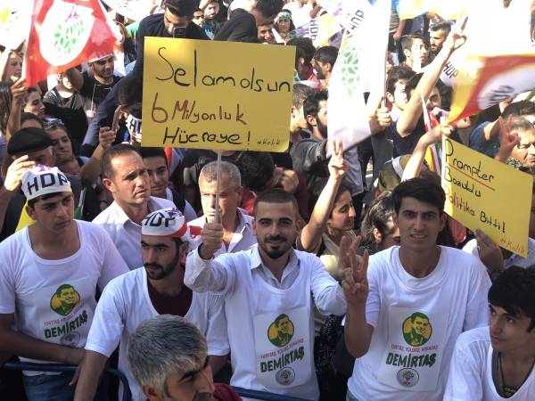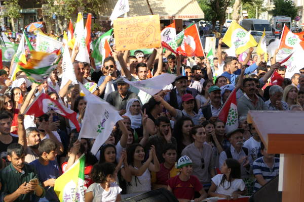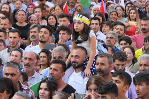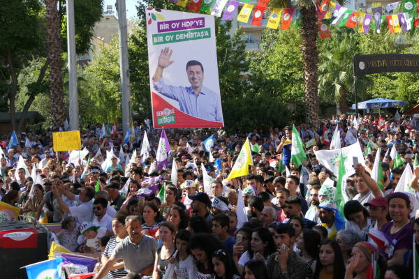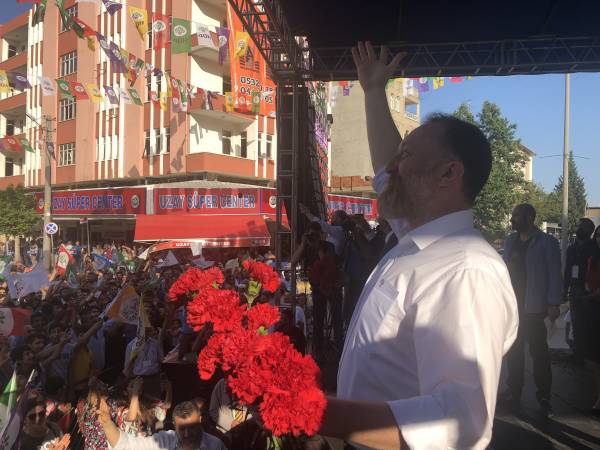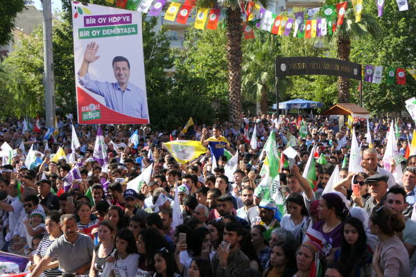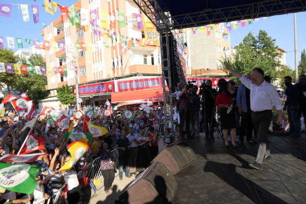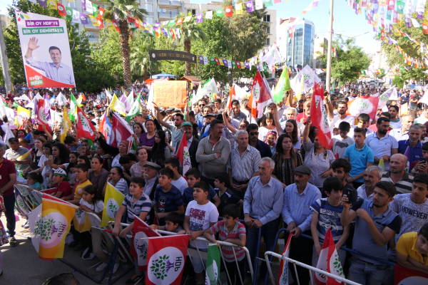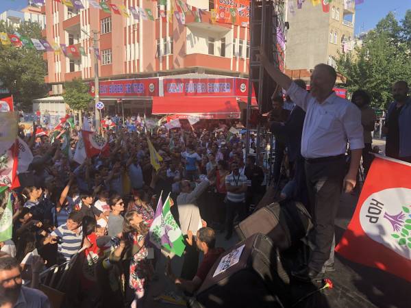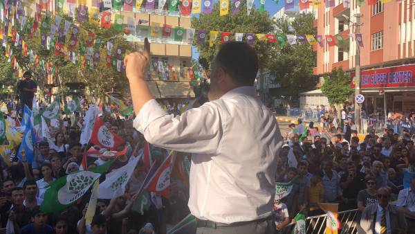 Piştî 24'ê Hezîranê hemû hevalên me yên girtî wê bên berdan. Ji ber ku tu sûcê wan tune ye. Ji ber fikrên xwe girtî ne. Piştî çûyîna Erdogan wê demokrasî bê. Wê aştî bê. Wê HDP bê. Ji ber ku em ê Destûra Bingehîn a Demokratîk ava bikin. Hemû nasname, bawerî û kesên cuda wê bi hev re bijîn û hemû mafê wan bi qanûnê bên mîsogerkirin. Em dibêjin ji metîngeriyê re bes e. Ji talankirina xwezayê re bêjin bes e. Em pergala heq û adîl dixwazin. Têkoşîna me ya pêşî, li dijî xizanî û nelirêtî ye. Têkoşîna me li dijî betaliyê ye. Em ê krîza aboriyê bê IMF çareser bikin. Hûn dizanin ku ger IMF bê divê zikê xwe jî biguvêşin. Yên bêjin pirsgirêka Kurd tune, hemû pirsgirêkan tune dihesibîne. Namzetê me Demîrtaş e. Demîrtaş namzetê Tirkiyeyê ye. Ji niha de dibêjin em nebin îktidar em ê hilbijartinek din çêkin. Ji niha de gefan dixwin."