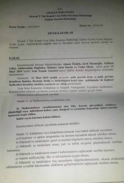 Hijmarên bi dîroka 11,12, 13,14 û 15'ê Adarê a rojnameya Yenî Yaşamê ku ji ser navê girtiyên siyasî Ahmet Ozturk, Şerîf Mesutoglu, Gokhan Çîftçî, Abdurrahman Dagdelen, Mehmet Şîrîn Durdu û Vedat Oktay diçû, bi hinceta ''gefê li ewlehiya saziyê dixwe'', Seroktiya Desteya Perwerdehiyê Girtîgehê nedane wan.