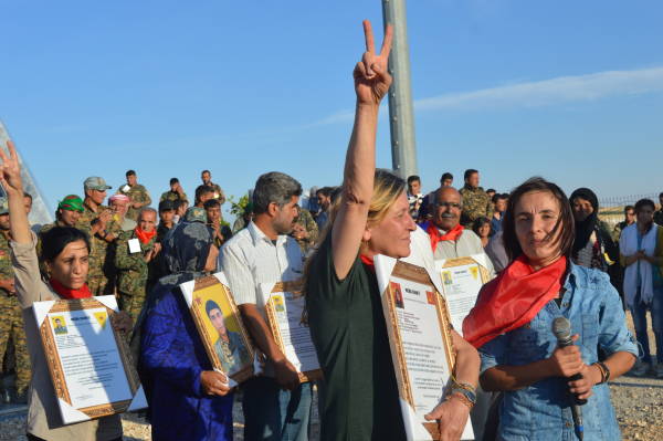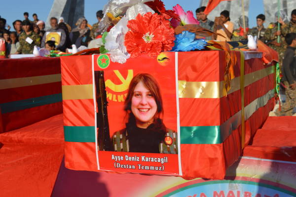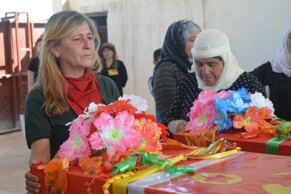 Welatiyên Kantona Kobanê cenazeyê şervana enternasyonalîst Desan Temûz û 4 şervanên azadiyê li Goristana Şehîd Dicle, spartin axê.