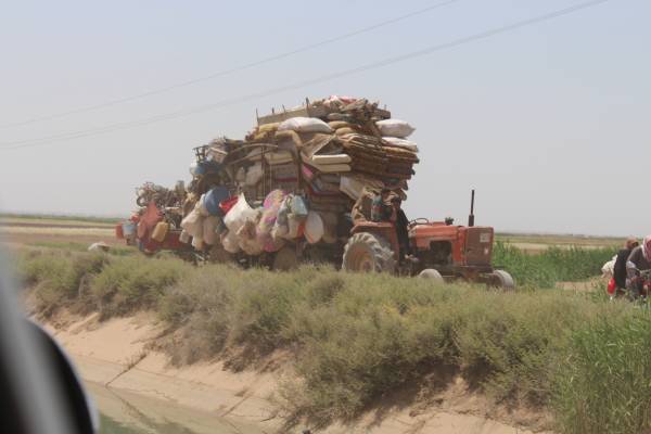 Di nava wesayîta de zêdebûna traktorê bala min kişand. Tankerên avê û mazotê jî gelek in. Taksî û mînîbus jî bê hejmar in. Ez hatim cem traktorekê. Bi rêya tercûmanekî min pirsî, ku barê traktorê hemû yê wî ye yan na. Ev bersiv da: "Eşyayê 13 malbatan e. 9 jê malbatên me ne, yên din jî cîranên me ne ku wesayîta wan nîne. Me zarok û extiyar jî lê siwar kirine. Yên ciwan bi traktorê re meşiyan û hatin heta vê derê."